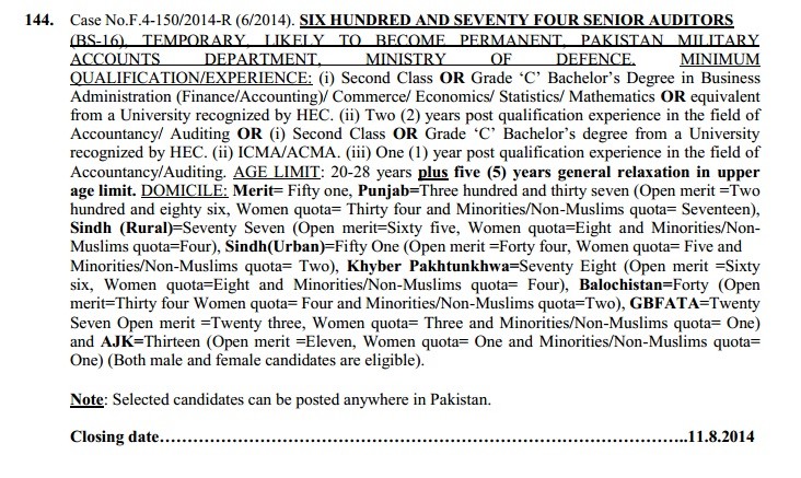 Federal Public Service Commission has announced 674 Vacancies of Senior Auditors BPS-16 in Pakistan Military Accounts Department. Closing date for these vacancies is 11th August 2014. These vacancies are temporary that are likely to be permanent.