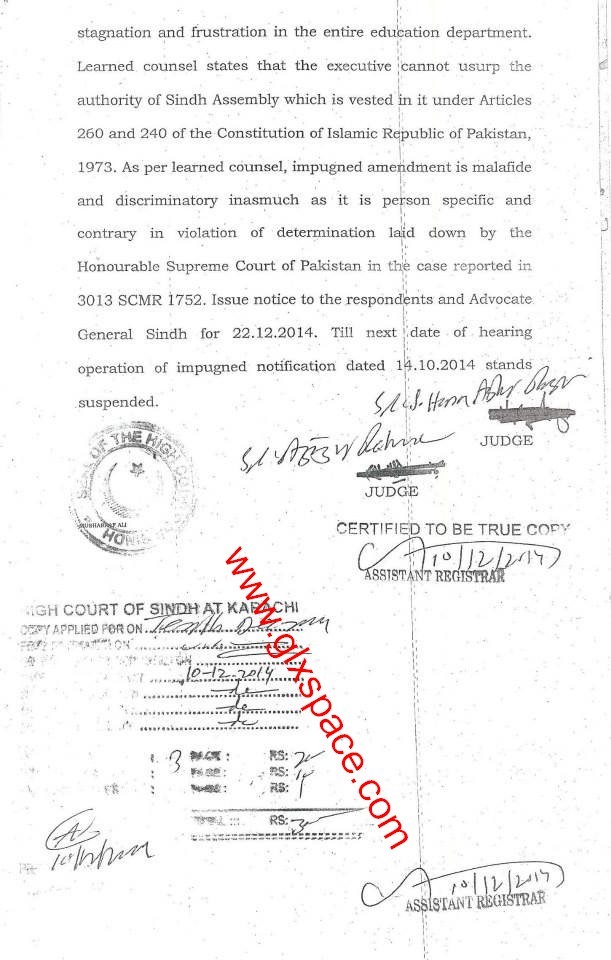 The High Court of Sindh at Karachi has issued Suspension of Orders of Recruitment Rules in Education Department Sindh on 09-12-2014. Some salient points of these orders are as under: