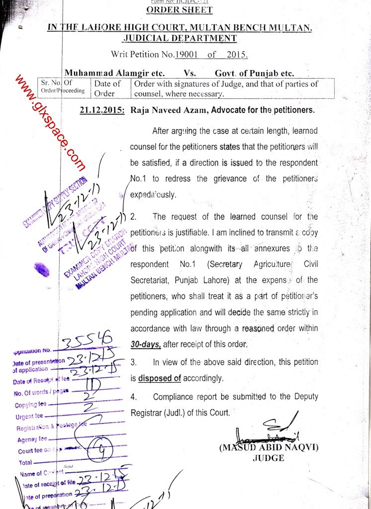 Judgment regarding M.Phil allowance in Lahore High Court, Multan Bench writ filed by the Employees of Agriculture Extension of Multan, Muzaffargarh and DG Khan District has been issued on 21-12-2105.