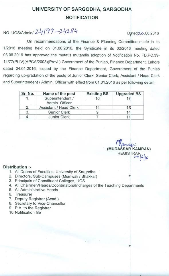 Special thanks to Mr. Maqsood Ahmad for sending the copy of the Notification of Upgradation of Clerical Staff University of Sargodha.
