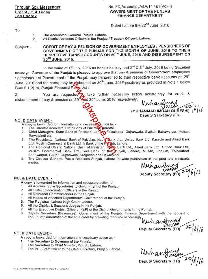 According to this Notification, in the wake of 1st July 2016 as bank holiday and 2nd and 3rd July 2016 as Gazetted Holidays, Governor of the Punjab is pleased to approve that pay and pension of Government Employees/Pensioners may be credited to their respective bank accounts on 29th June 2016 and the same may be disbursed on 30th June 2016 positively.