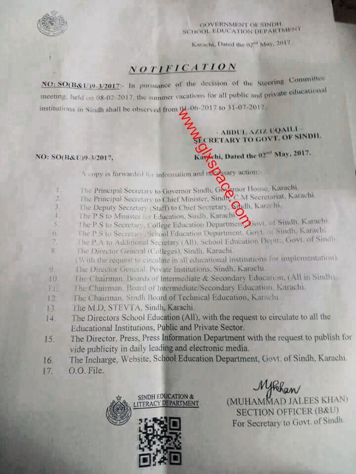 Special thanks to Mr. Muhammad Waliullah for sending the copy of the Notification of Summer Vacation Sindh Govt Schools 2017.
