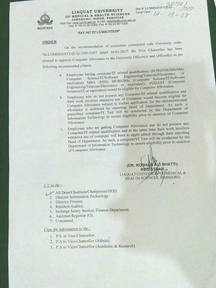 Liaquat University of Medical & Health Sciences Jamshoro Sindh has issued Notification on 18-09-2017 in connection with Computer Allowance to the University Officers & Officials.