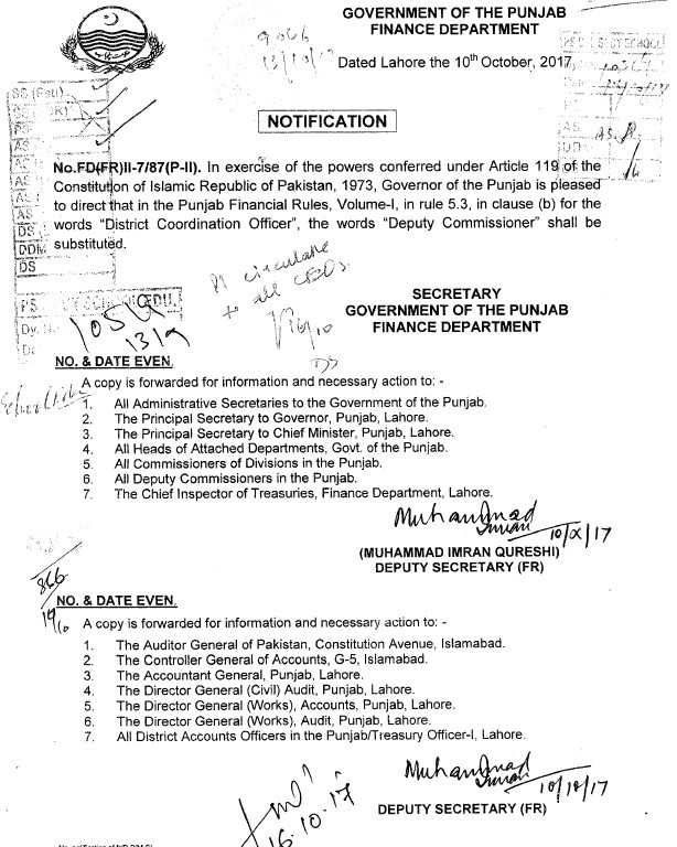 In exercise of the powers conferred under Article 119 of the Constitution of Islamic Republic of Pakistan 1073, Governor of the Punjab is pleased to direct that in Punjab Financial Rules, Volume-I, in rule 5.3, in clause (b) for the words “District Coordination Officer” the words “Deputy Commissioner” shall be substituted.
