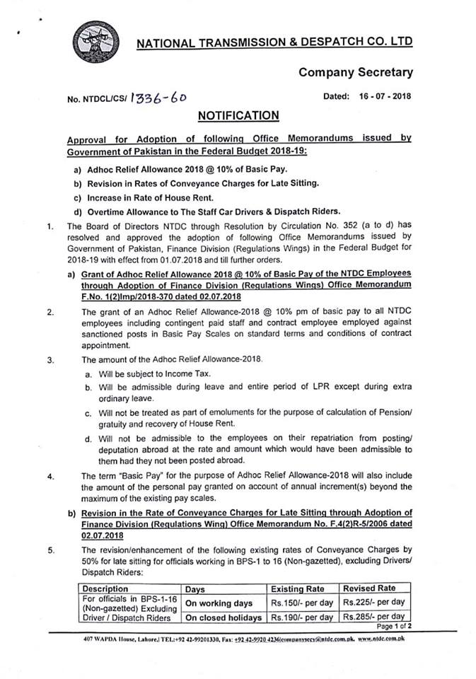 - The Board of Directors NTDC through Resolution by Circulation No. 352 (a to d) has resolved and approved the adoption of following Office Memorandums issued by Governments of Pakistan, Finance Division (Regulations Wings) in the Federal Budget for 2018-19 with effect from 01.07.2018 and till further orders.
