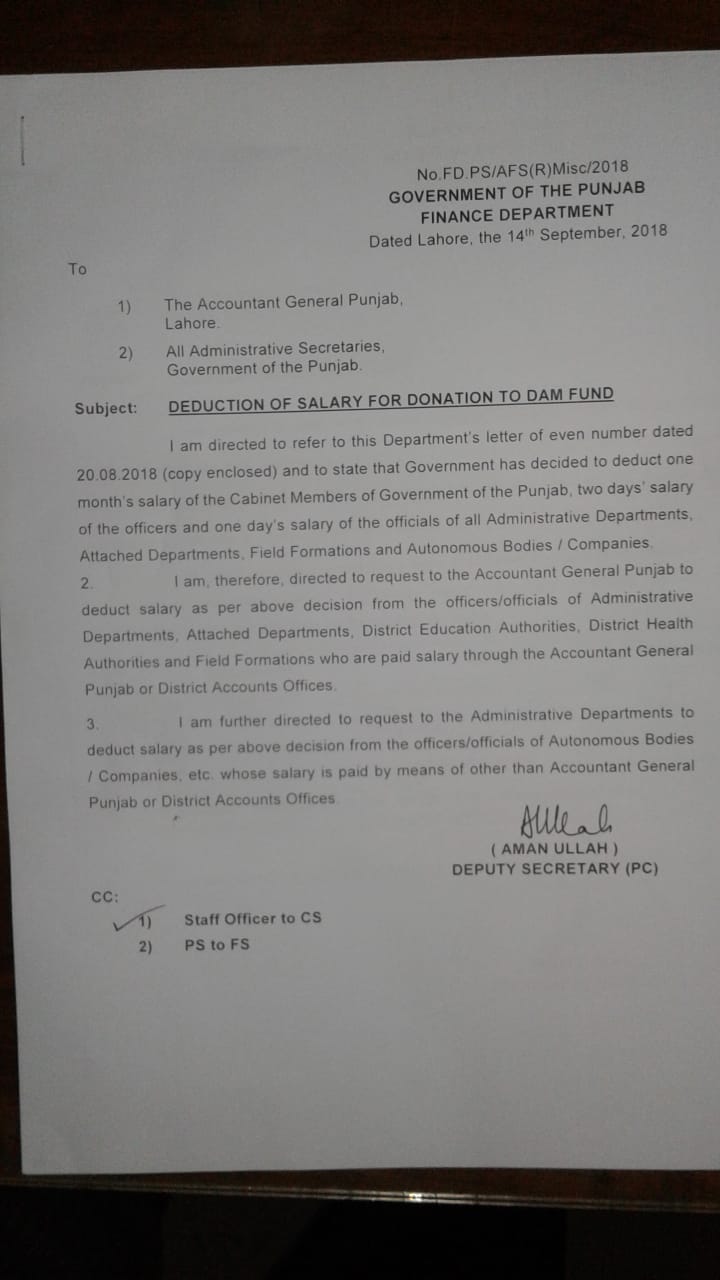Special thanks to Mr. Zahid Khan for sending the copy of the Notification of Deduction of Salary Punjab Employees for Donation to DAM Fund.