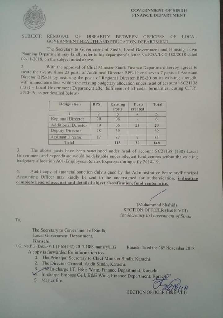 - With the approval of Chief Minister Sindh Finance Department hereby agrees to create the twenty three 23 posts of Additional Director BPS-19 and seven 7 posts of Assistant Director BPS-17 by restoring the posts of Regional Director BPS-20 on its existing strength, with immediate effect within the budgetary allocation under head of account “SC21138 (138) – Local Government Department after fulfillment of all codal formalities, during C.F.Y. 2018-19, as per detailed below:-