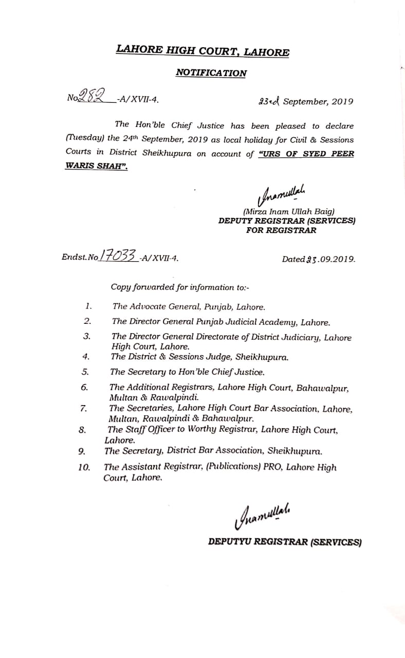 The hon’able Chief Justice Lahore High Court Lahore has been pleased to declare (Tuesday) the 24th December,2019 as local holiday for Civil & Sessions Courts in District Sheikhupura on account of “Urs of Syed Peer Waris Shah”