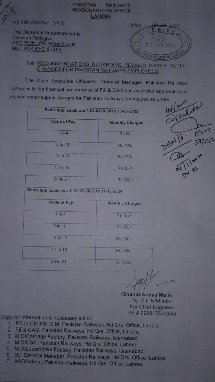 Pakistan Railways Headquarters Office, Lahore has issued letter on 21-01-2020 in connection with Recommendations Regarding Revised Water Supply Charges for Pakistan Railways Employees. Detail is as under: