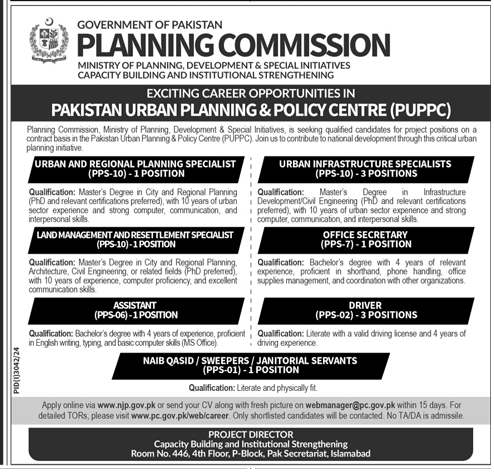 The Planning Commission, Ministry of Planning & Special Initiatives, is seeking qualified candidates for contract project positions in the Pakistan Urban Planning & Policy Centre (PUPPC). Join us in contributing to national development through this critical urban planning initiative.
