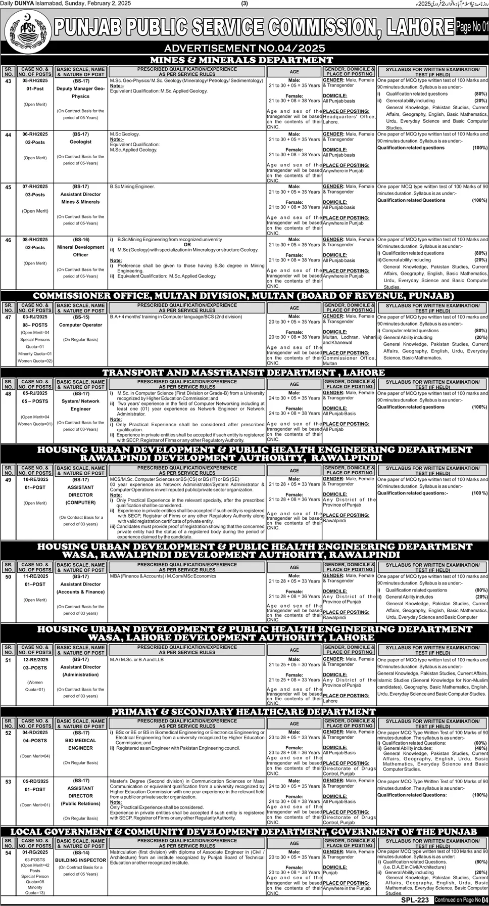 - Closing Date for Submission of Online Applications for Job Vacancies through PPSC in Punjab Government 2025 is 10 February 2025.