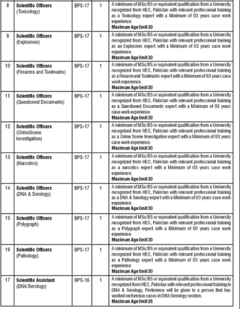 | 9 | Scientific Officer (Explosives) | BPS-17 | 1 Vacancy | A minimum of MSc/BS or equivalent qualification from a university recognized by HEC, Pakistan, with relevant professional training as an Explosives expert and a minimum of 3 years of casework experience. | Age should not be more than 30 years |