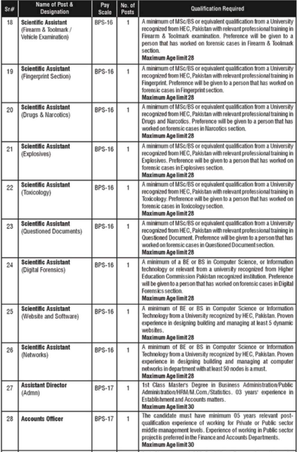 | 17 | Scientific Assistant (DNA/Serology) | BPS-16 | 1 Vacancy | A minimum of MSc/BS or equivalent qualification from a university recognized by HEC, Pakistan, with relevant professional training in DNA & Serology. Preference will be given to a person who has worked on forensic cases in the DNA/Serology section. | Age should not be more than 28 years |
