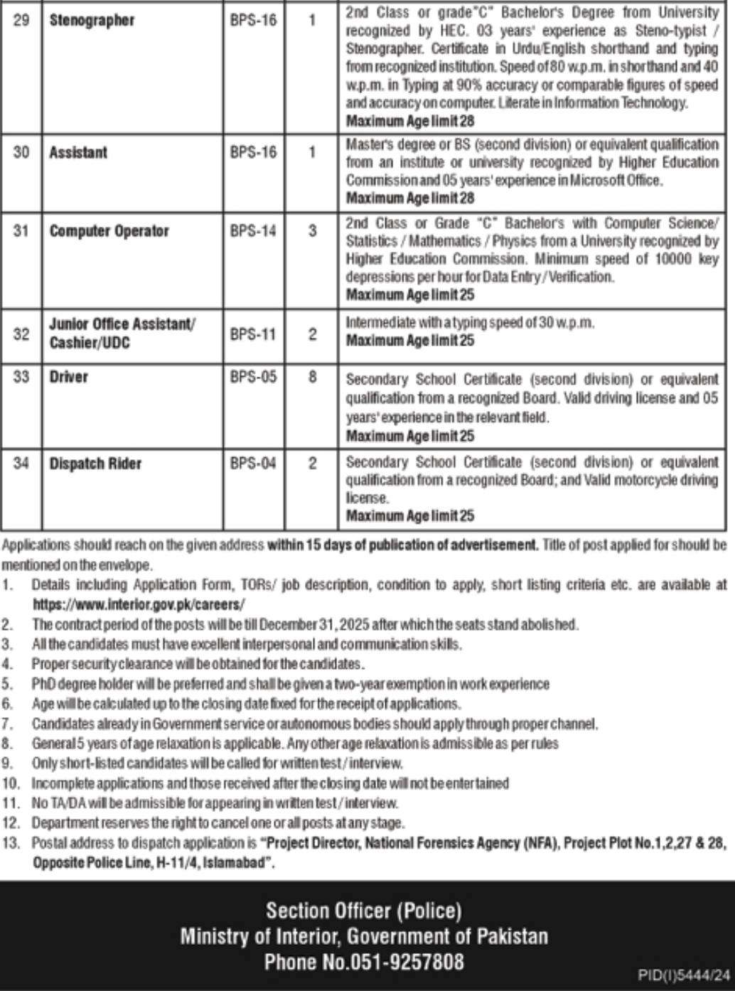 - Postal Address for Applications: Project Director, National Forensics Agency (NFA), Project Plot No. 1, 2, 27 & 28, Opposite Police Line, H-11/4, Islamabad.