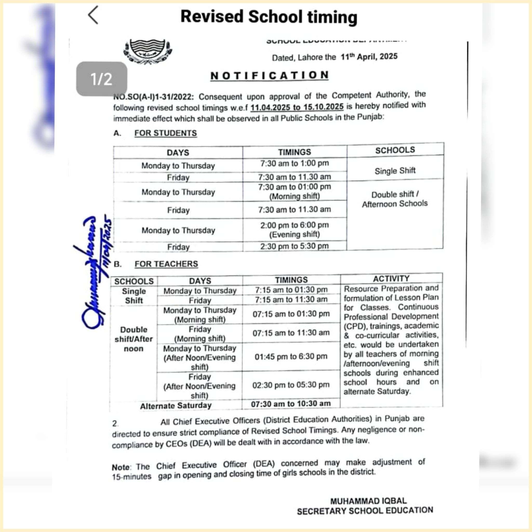 As per the Notification No.SO(A-I)1-31/2022 and consequent upon approval of the Competent Authority, the following revised school timings w.e.f. 11.04.2025 to 15.10.2025 SED Punjab notifies with immediate effect. All Public Schools in the Punjab will observe the same.
