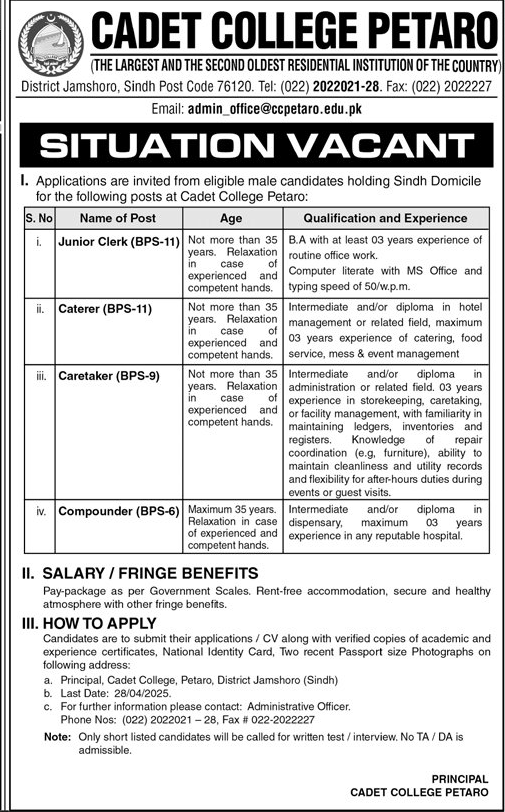 I’m sharing the latest BPS-06 to BPS-11 Vacancies in CC Petaro Sindh. These jobs in Cadet College Petaro are for Sindh domicile holders. Various posts are open for qualified male candidates.