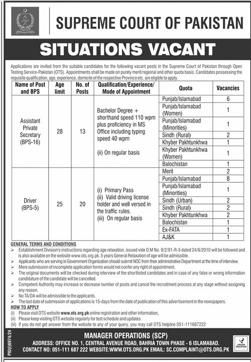 Applications are invited from suitable candidates for the following vacant posts in the Supreme Court of Pakistan through the Open Testing Service (OTS). Appointment shall be made on purely merit/regional and other quota basis. Candidates possessing the requisite qualifications, age, experience, and domicile of the respective province, etc., are eligible to apply.