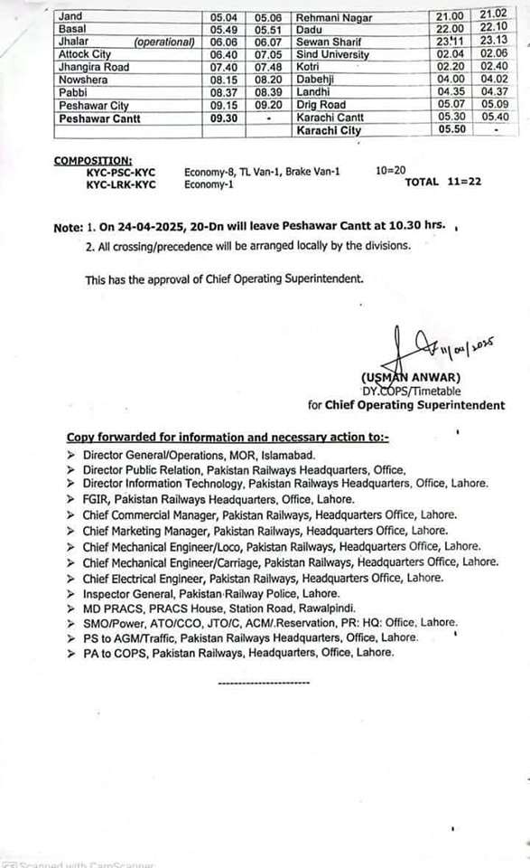 1. On 24-04-2025, 20-Dn will leave Peshawar Cantt at 10.30 hrs.