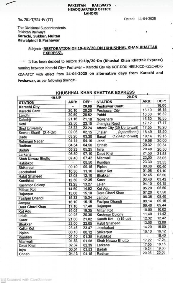 As per the Notification issued by the HQ Pakistan Railways, it has been decided to restore 19-Up/20-Dn (Khushhal Khan Khattak Express) running between Karachi City – Peshawar – Karachi City via KOT-DDU-HBKJ-JCD-KZLC-ADK- KDA-ATCY with effect from 24-04-2025 on alternative days from Karachi and Peshawar, as per the following timings:-