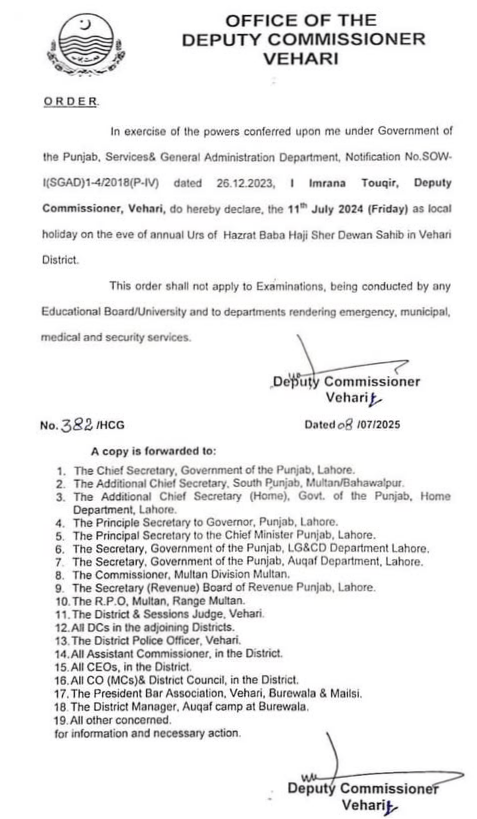 In exercise of the powers conferred upon me under the Government of the Punjab, Service & General Administration Department, Notifications No.SOW_I(SGAD)1-4/2018(P-IV) dated 26-12-2023, I Imrana Touqir, Deputy Commissioner, Vehari, do hereby declare, the 11th July 2025 (Friday) as local holiday on the eve of annual Urs of Hazrat Baba Haji Sher Dewan Sahib in Vehari District.
