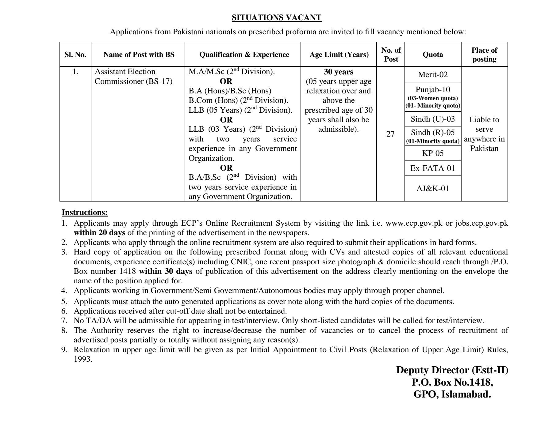 - Applicants may apply through ECP’s Online Recruitment System by visiting the ECP website within 20 days of the printing of the advertisement in the newspaper/