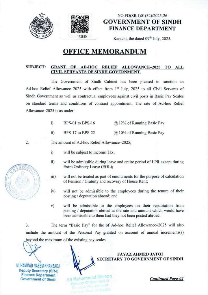 Grant of Adhoc Relief Allowance 2025 Sindh @ 12% and 10%