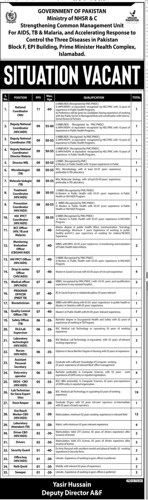 Ministry of NHSR&C Jobs 2025 has been announced for various positions under the AIDS, TB & Malaria Control Program.