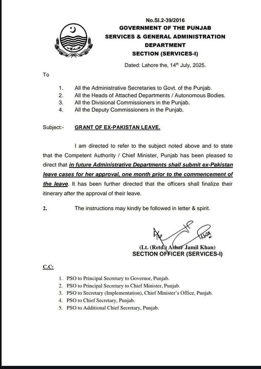 Government of the Punjab, Services & General Administrative Department issued a Notification on 14-07-2025 in connection with the Grant of Ex-Pakistan Leave by CM Punjab / Competent Authority. The details are as follows: