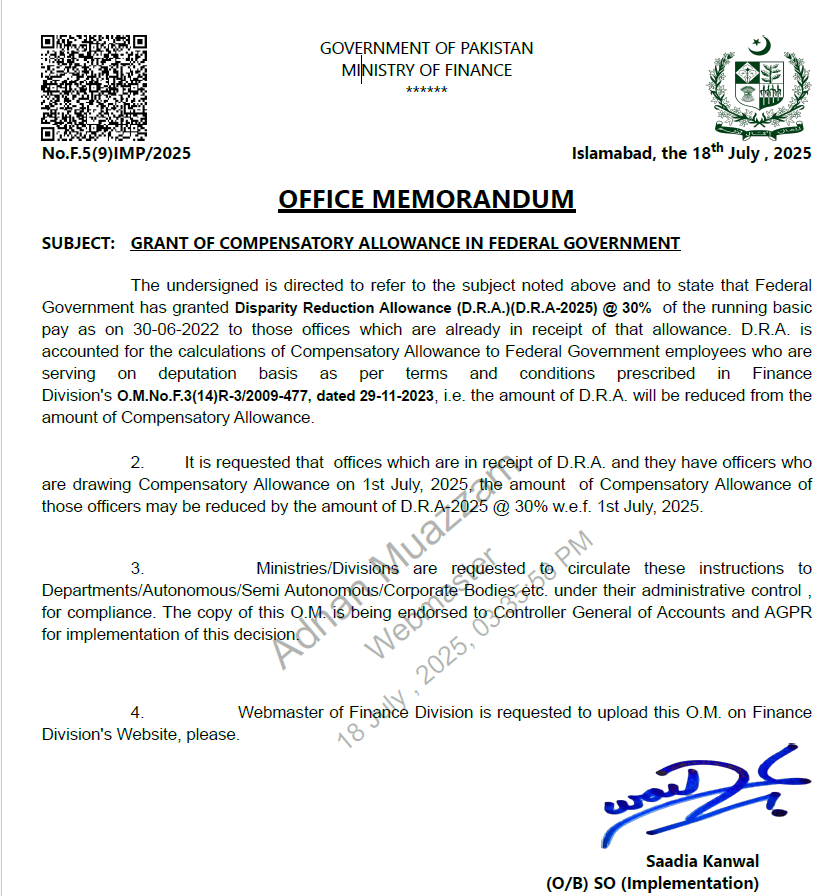 As per the Notification, the undersigned is directed to refer to the subject noted above and to state that the Federal Government has granted Disparity Reduction Allowance (D.R.A.) (D.R.A-2025) @ 30% of the running basic pay as on 30-06-2022 to those offices which are already in receipt of that allowance. D.R.A. is accounted for the calculations of Compensatory Allowance to Federal Government employees who are serving on a deputation basis as per terms and conditions prescribed in Finance Division’s O.M.No.F.3(14)R-3/2009-477, dated 29-11-2023, i.e., the amount of D.R.A. will be reduced from the amount of Compensatory Allowance. 2. It is requested that offices which are in receipt of D.R.A. and have officers who are drawing Compensatory Allowance on 1st July, 2025, the amount of Compensatory Allowance of those officers may be reduced by the amount of D.R.A-2025 @ 30% w.e.f. 1st July, 2025. 3. Ministries/Divisions are requested to circulate these instructions to Departments/Autonomous/Semi-Autonomous/Corporate Bodies, etc., under their administrative control, for compliance. The copy of this O.M. is being endorsed to the Controller General of Accounts and AGPR for the implementation of this decision. 4. Webmaster of Finance Division is requested to upload this O.M. on Finance Division’s Website, please