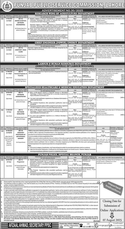 PPSC Jobs July 2025 have been announced through Advertisement No. 30/2025 by Punjab Public Service Commission. The Jobs are from BPS-16 to BPS-18. The details of posts are shown below