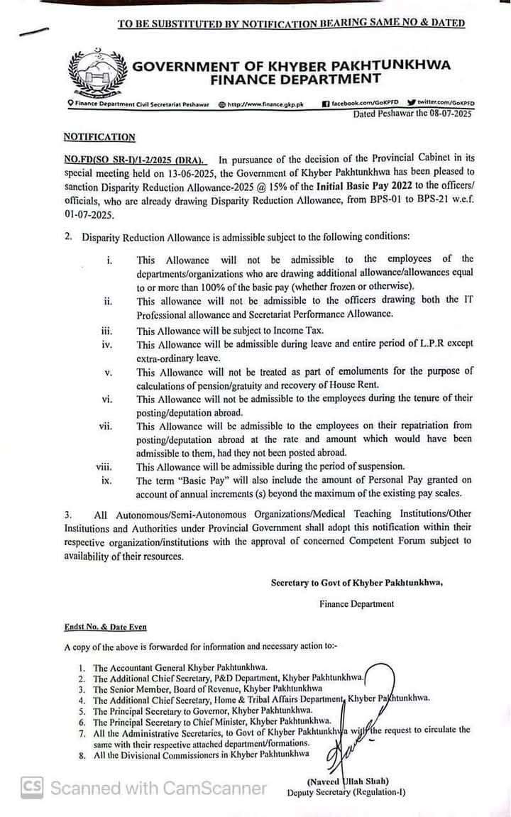 As per the Notification, the Governor of the KP is pleased to announce an increase in DRA from 15% to 30% of the initial Basic Pay Scales 2022 to all those employees who are already getting Disparity Reduction Allowance. These employees are from BPS-01 to BPS-19. They will get this DRA with effect from 1st July 2025.