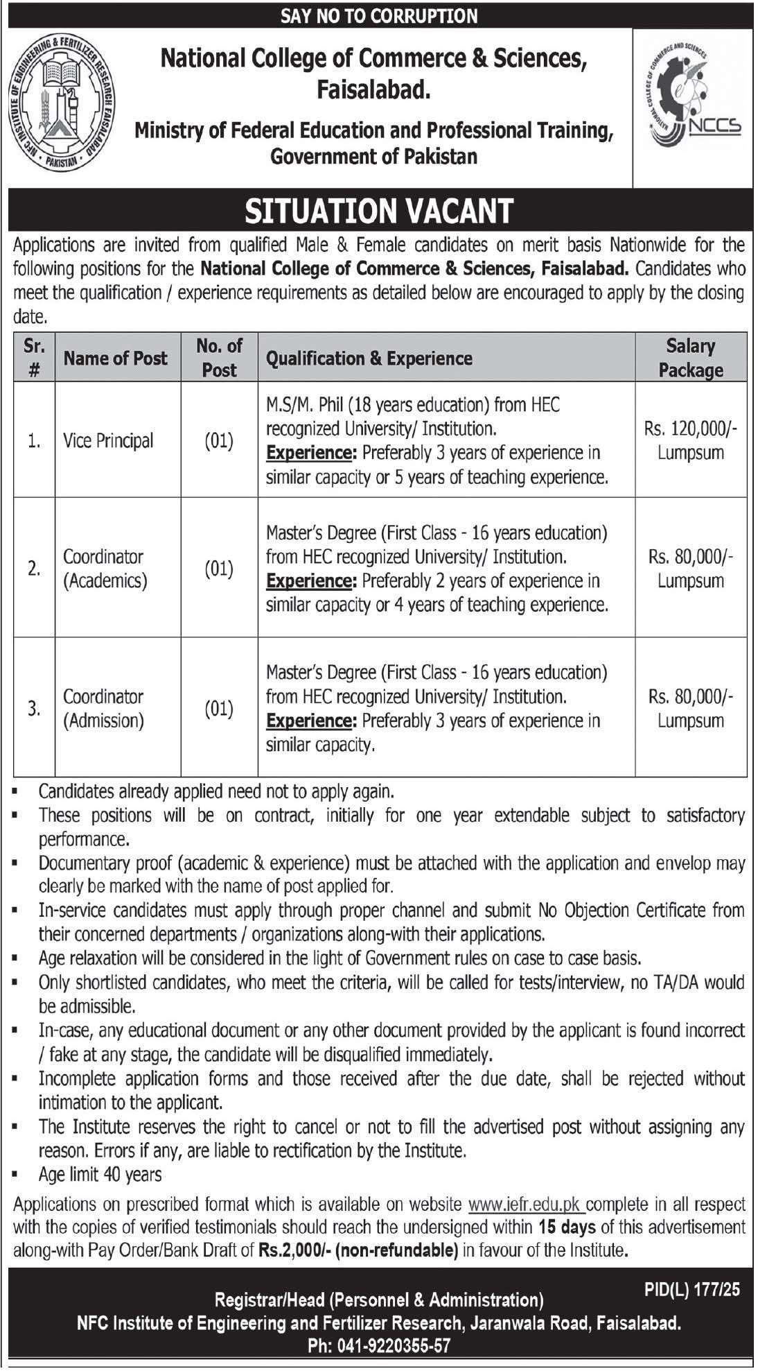 I am sharing the latest National College Job Vacancies announced by the National College of Commerce & Sciences, Faisalabad, under the Ministry of Federal Education and Professional Training. THe detials of the posts are shown below