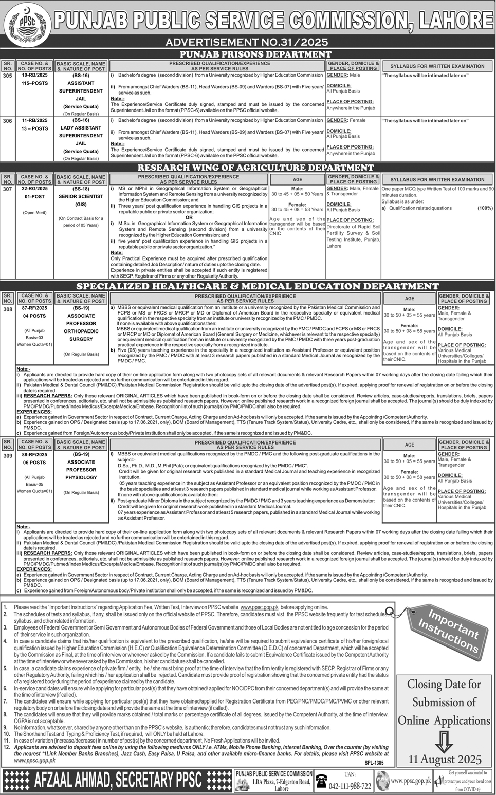 I am sharing the latest Assistant Superintendent Jail Vacancies through PPSC 2025. The Punjab Public Service Commission has issued Job Ad No. 31/2025. These jobs are in the Punjab Prison Department, the Research Wing of the Agriculture Department, and the Specialized Healthcare & Medical Education Department. The details are as follows: