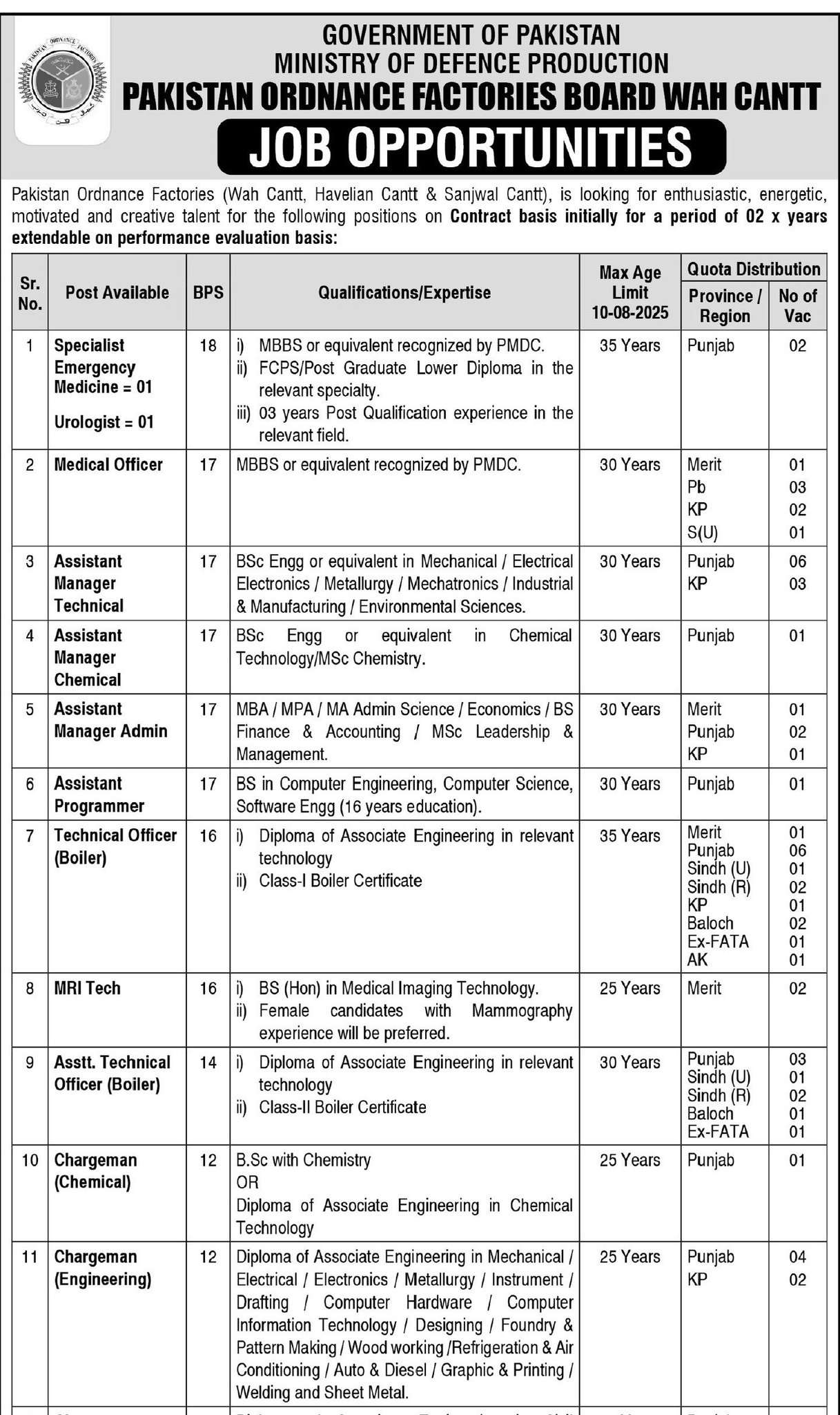 Pakistan Ordinance Factories (Wah Cantt, Havelin Cantt & Sanjwal Cantt), is looking for enthusiastic, energetic, motivated and creative talent for the following positions on a contract basis initially for 2 years, extendbale on a performance evaluation basis: