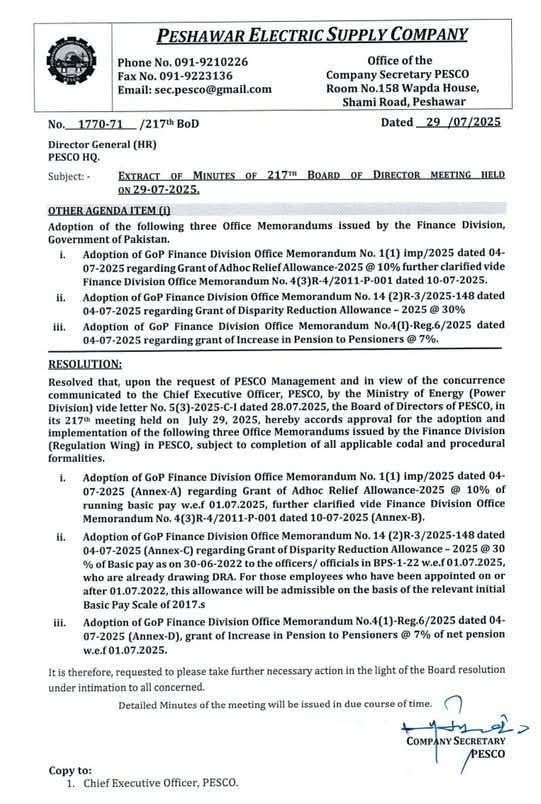 As per Notification, Resolved that, upon the request of PESCO Management and the view of the concurrence communicated to the Chief Excusive Officer, PESCO by the Ministry of Energy (Power Division) vide letter No. 5(3)-2025-C-I dated 28-7-2025. the board of directors of PESCO in its 217th meeting help on July 29, 2025 hereby accords approval for the adoption and implementation of the following three office memorandums issued by the Finance Division (Regulation Wing) in PESCO, subject to completion of all applicable codal and procedural formalities.