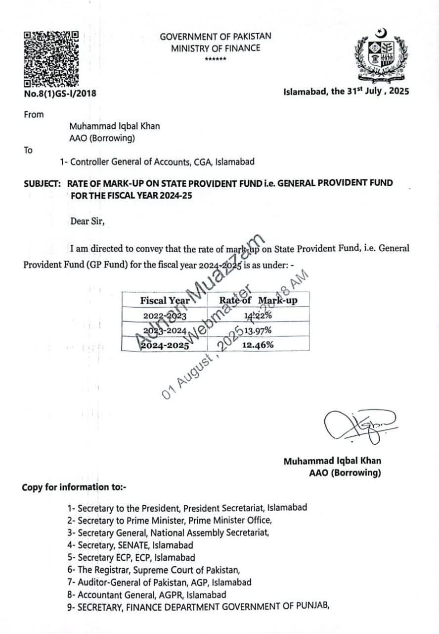 Ministry of Finance issued the GP Fund Markup Rates 2023-24 @ 13.97% last year. However, for the years 2024-2025, these rates are 12.46%.