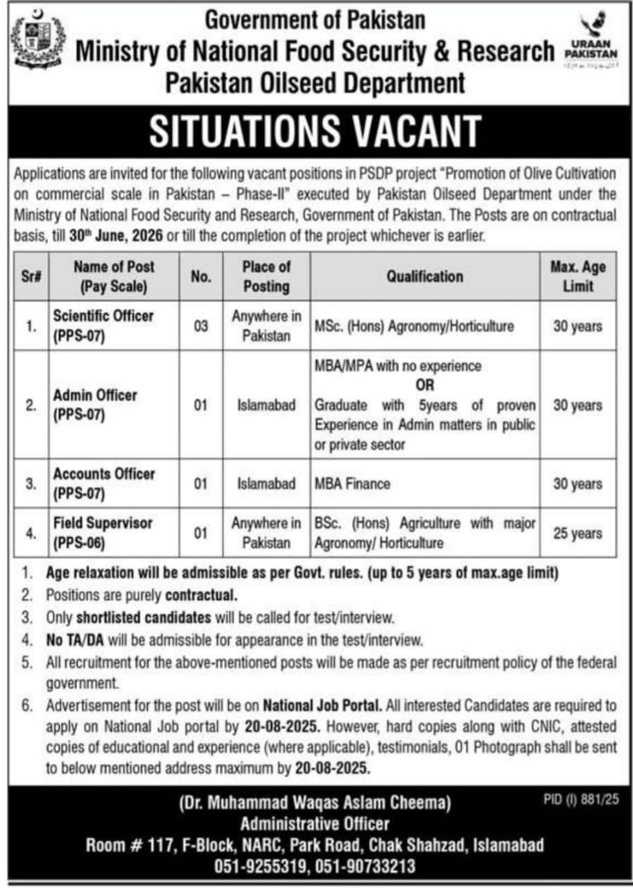 Applications are invited for the following vacant positions in the PSPD Project “Promotion of Olive Cultivation on Commercial sale in Pakistan – Phase-II” executed by the Pakistan Oilseed Department under the Ministry of National Food Security and Research, Government of Pakistan. The posts are on a Contractual basis, till 30th June 2026 or till the completion of the project, whichever is earlier.