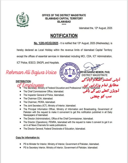 As per the Notification, in exercise of the powers conferred upon me vide Notification No. SOW-I(S&GAD)1-4-2018(Pt-IV), dated 26-01-2023, issued by the Services and General Administration Department, Government of the Punjab, Lahore I, Dr. Hassan Waqar Sheema, Deputy Commissioner, Rawalpindi, declares a local holiday in Rawalpindi District on 13-08-2025. However, all emergency dealing departments/institutions/authorities will remain operational.