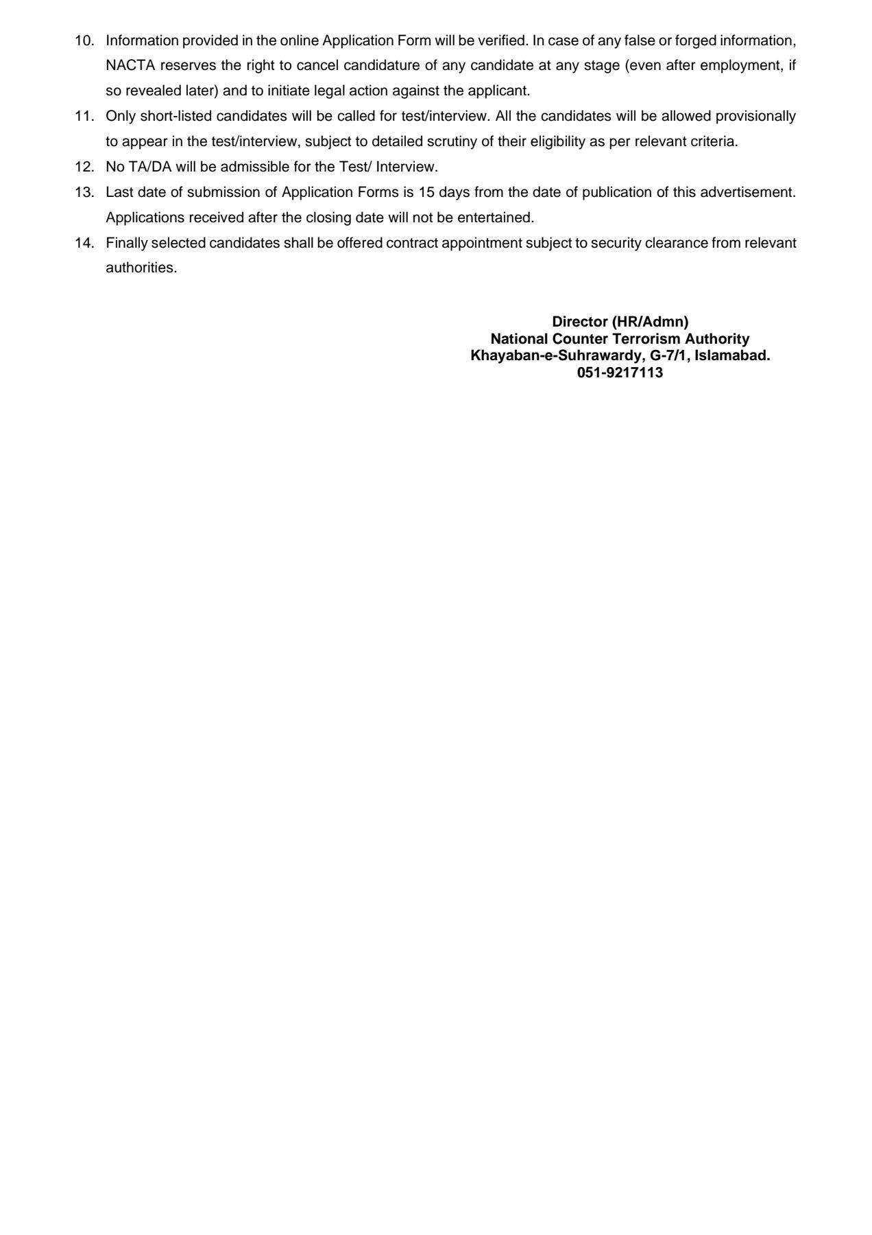 | 1. | Deputy Director (G&SI) | BPS-18 | 01 Vacancy (Contract basis for a period of 01 year) | Merit | 35 Years | Liable to serve anywhere in Pakistan |