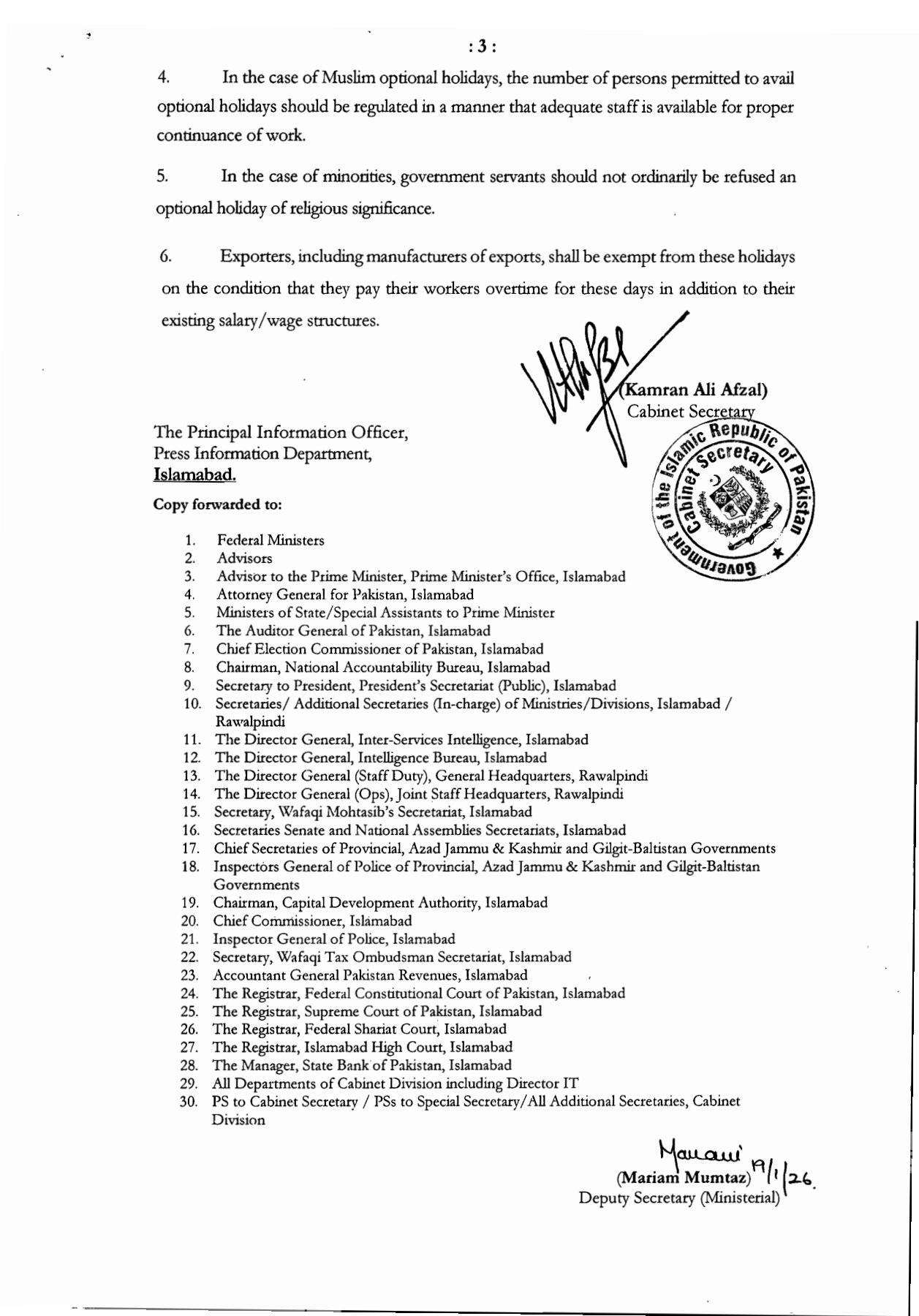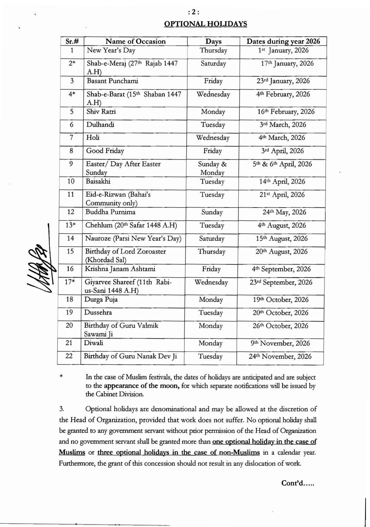 The public holidays on dates of national significance and festivals of Muslims and religious minority communities in Pakistan for the calendar year 2026 shall be as under:-