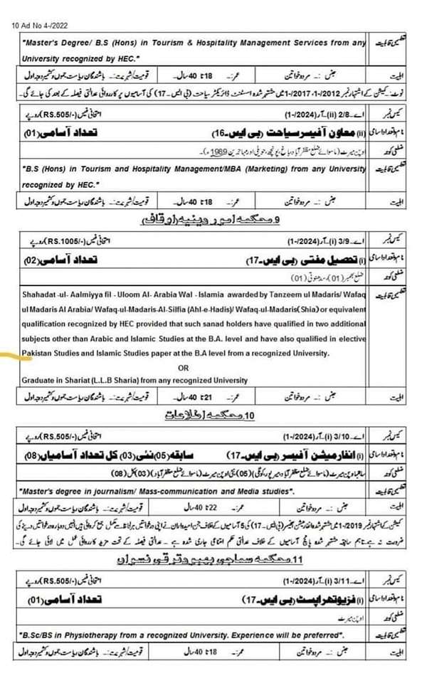 | 1. | Assistant Director Tourism | BPS-17 | 01 Vacancy | Female or Male |