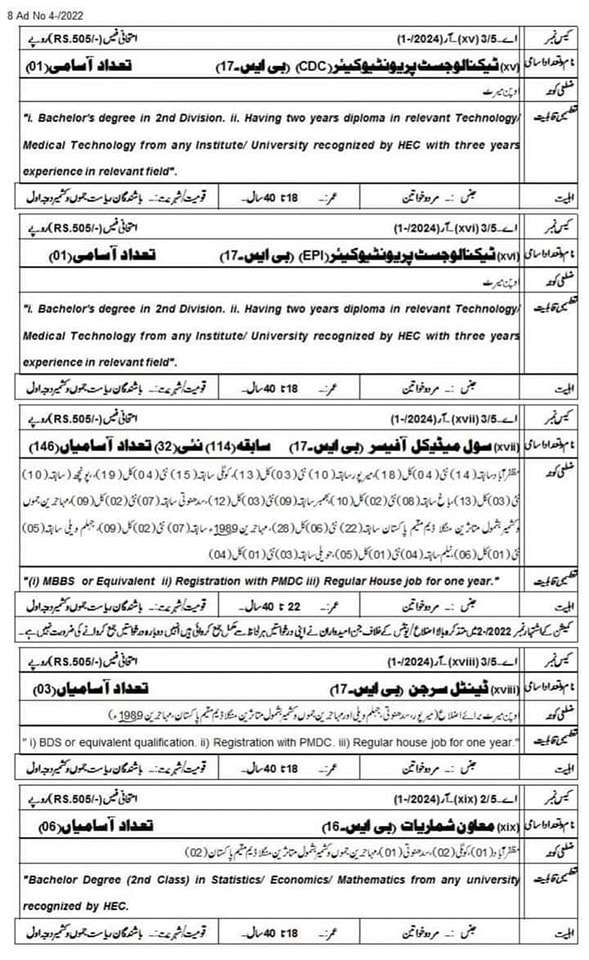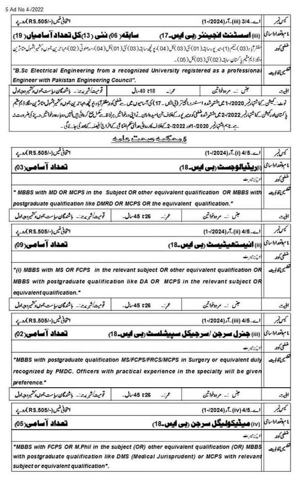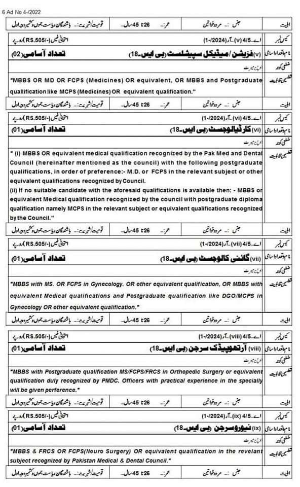 | 4. | Medicilogical Surgan | BPS-18 | 05 Vacancies | Female or Male |