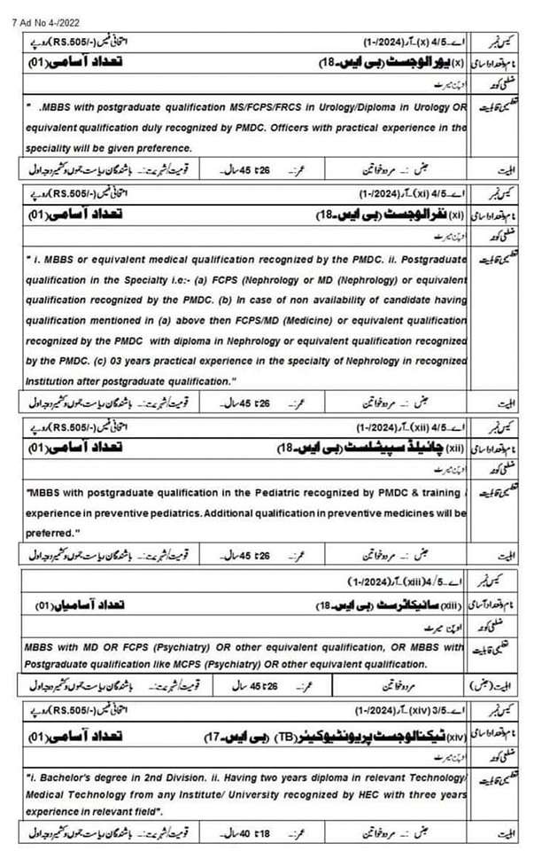 | 10. | Urologist | BPS-18 | 01 Vacancy | Female or Male |