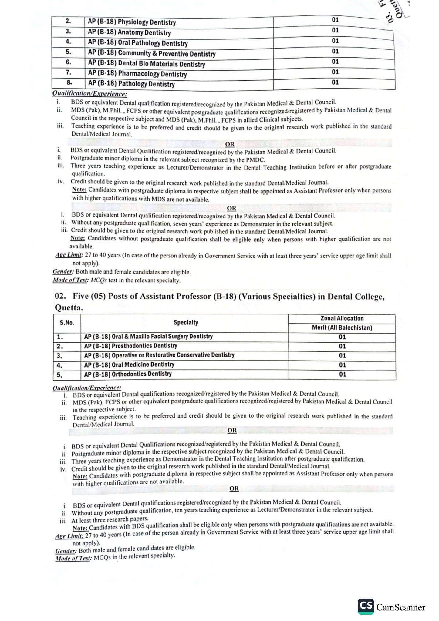 | 1 | Dental College Quetta | Assistant Professor | BPS-18 | 08 Vacancies |