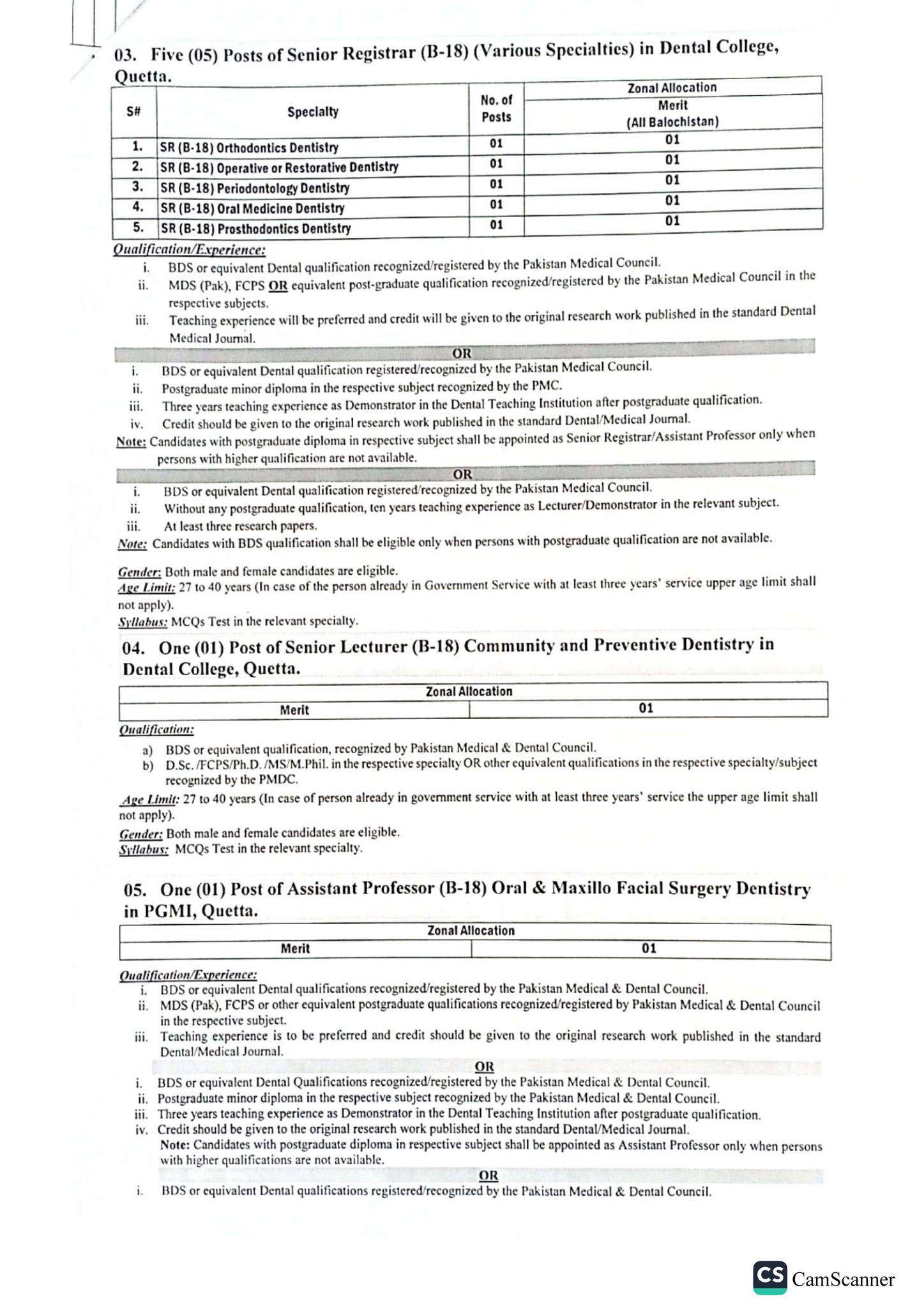 | 4 | Community and Preventive Dentistry in Dental College Quetta | Senior Lecturer | BPS-18 | 01 Vacancy |