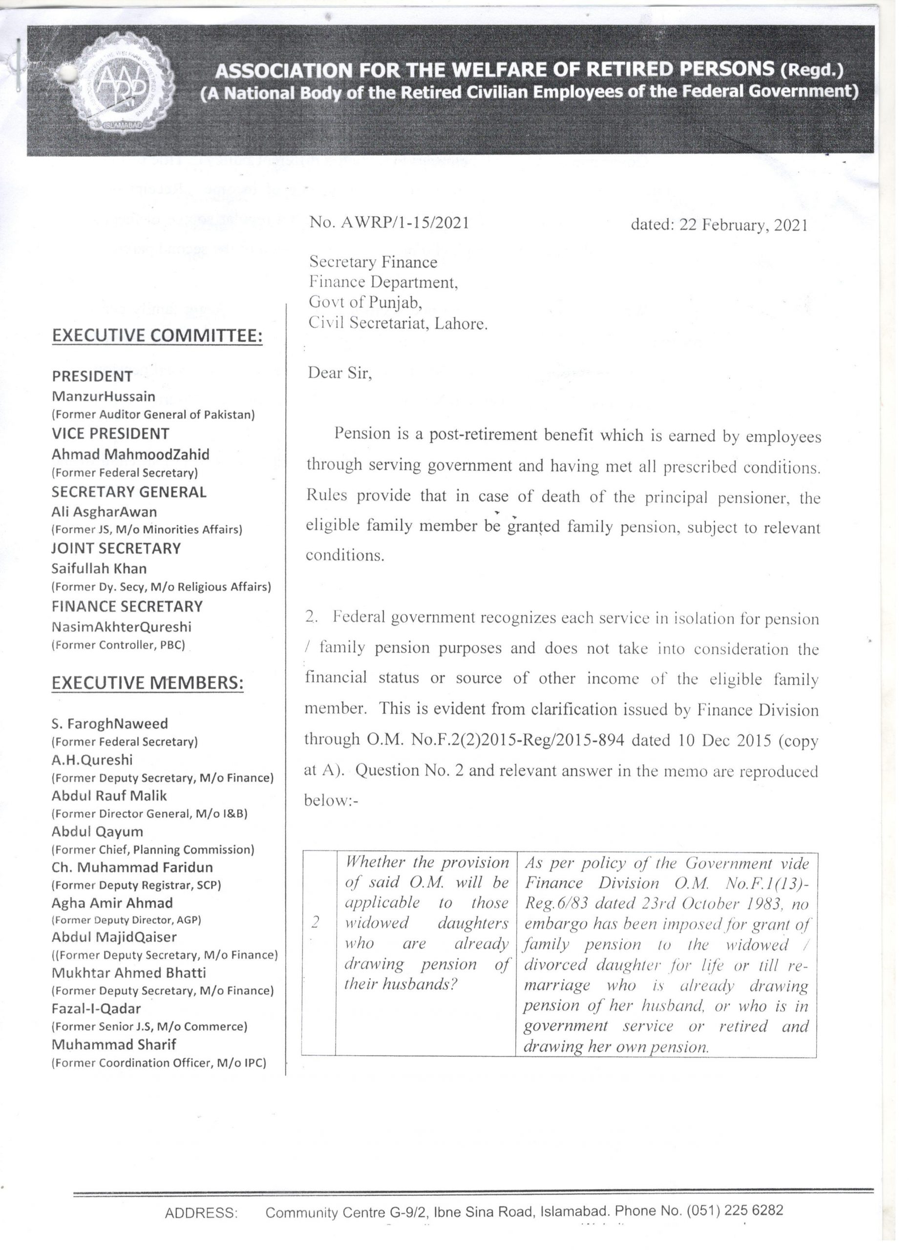 - The federal government recognizes each service in isolation for pension/family pension purposes and does not take into consideration the financial status or source of other income of the eligible family member. This is evident from clarification issued by Finance Division through O.M. No.F.2(2)2015-Reg/2015-894 dated 10 Dec 2015 (copy at A). Question No. 2 and relevant answer in the memo are reproduced below:-