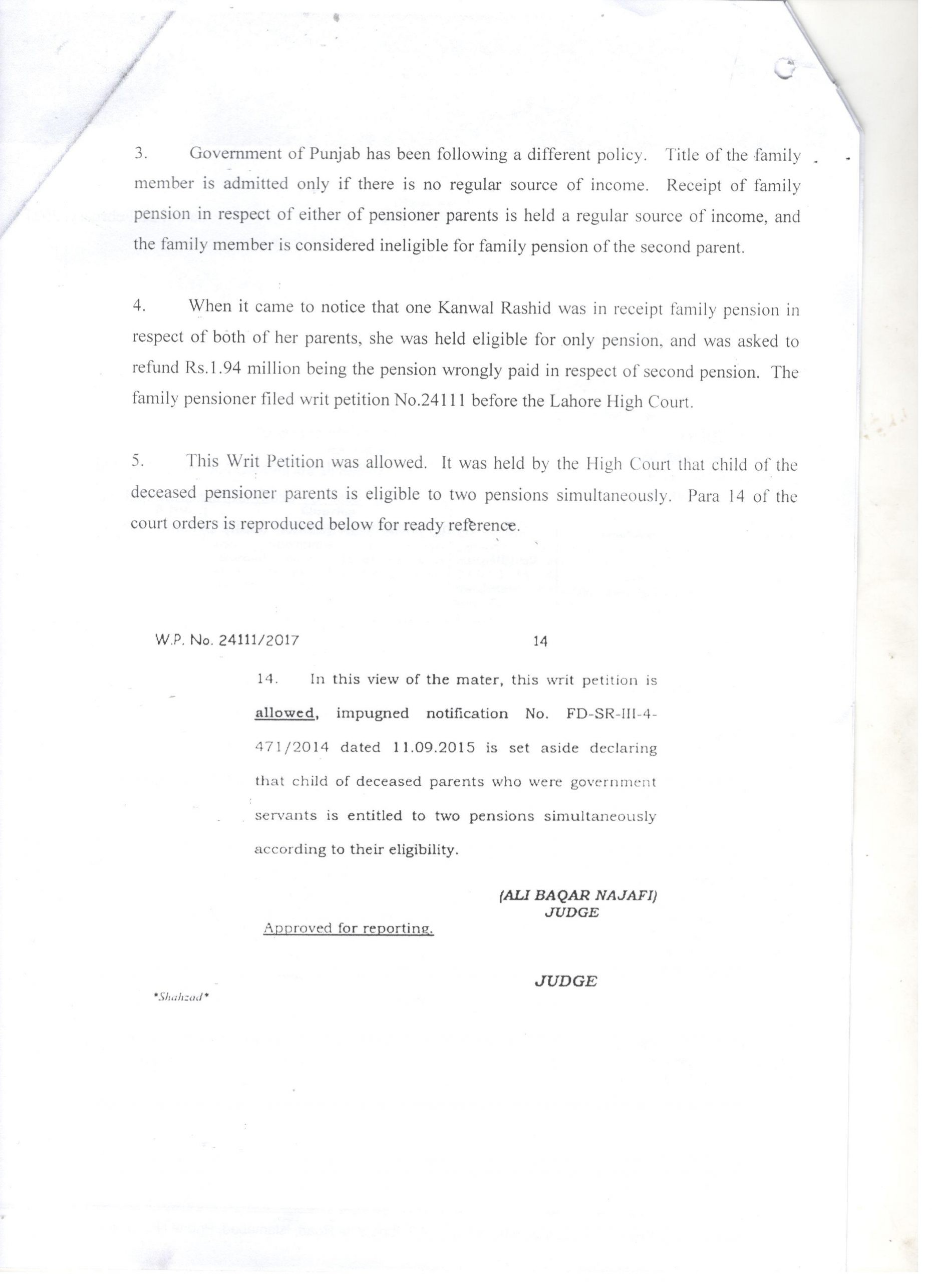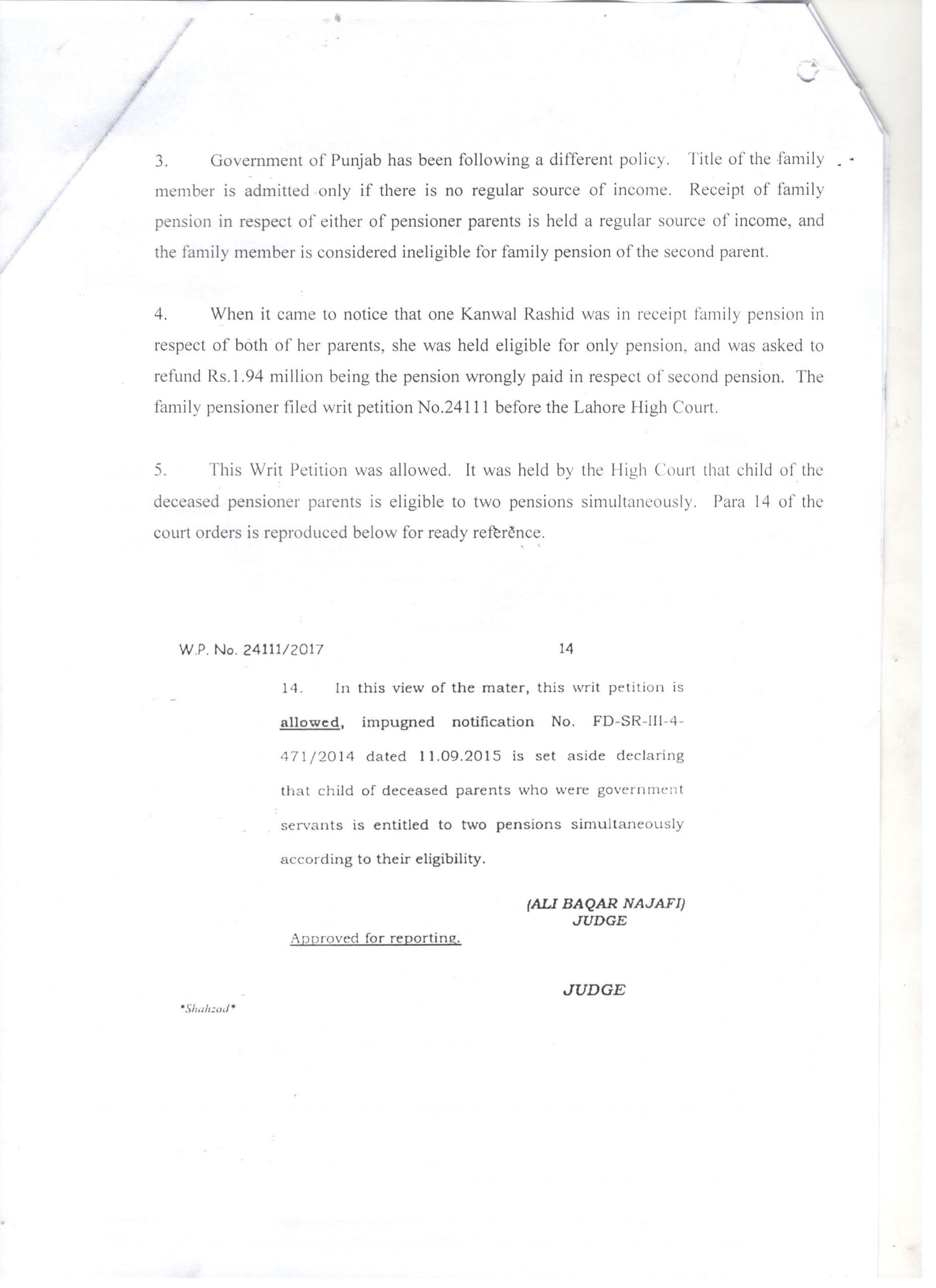 - When it came to notice that one Kanwal Rashid was in receipt of two family pensions in respect of both of her parents. She was held eligible for the only pension and was asked to refund Rs.1.94 million being the pension wrongly paid in respect of the second pension. The family pensioner filed writ petition No.24111 before the Lahore High Court.