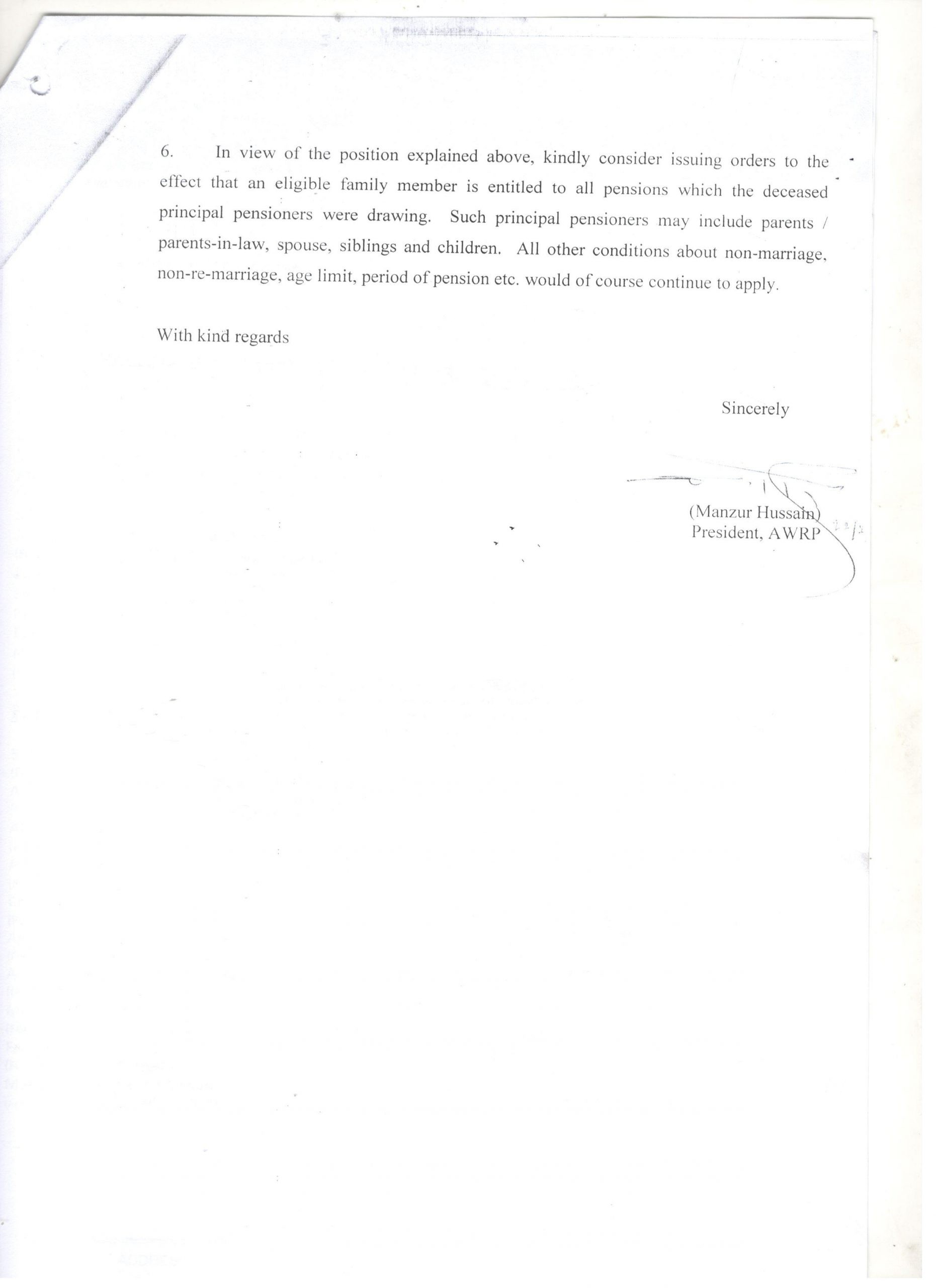 - In view of the position explained above, kindly consider issuing orders to the effect that an eligible family member is entitled to all pensions. That the deceased principal pensioners were drawing. Such principal pensioners may include parents/parents-in-law, spouses, siblings, and children. All other conditions about non-marriage, non-re-marriage, age limit, a period of pension, etc. would of course continue to apply.