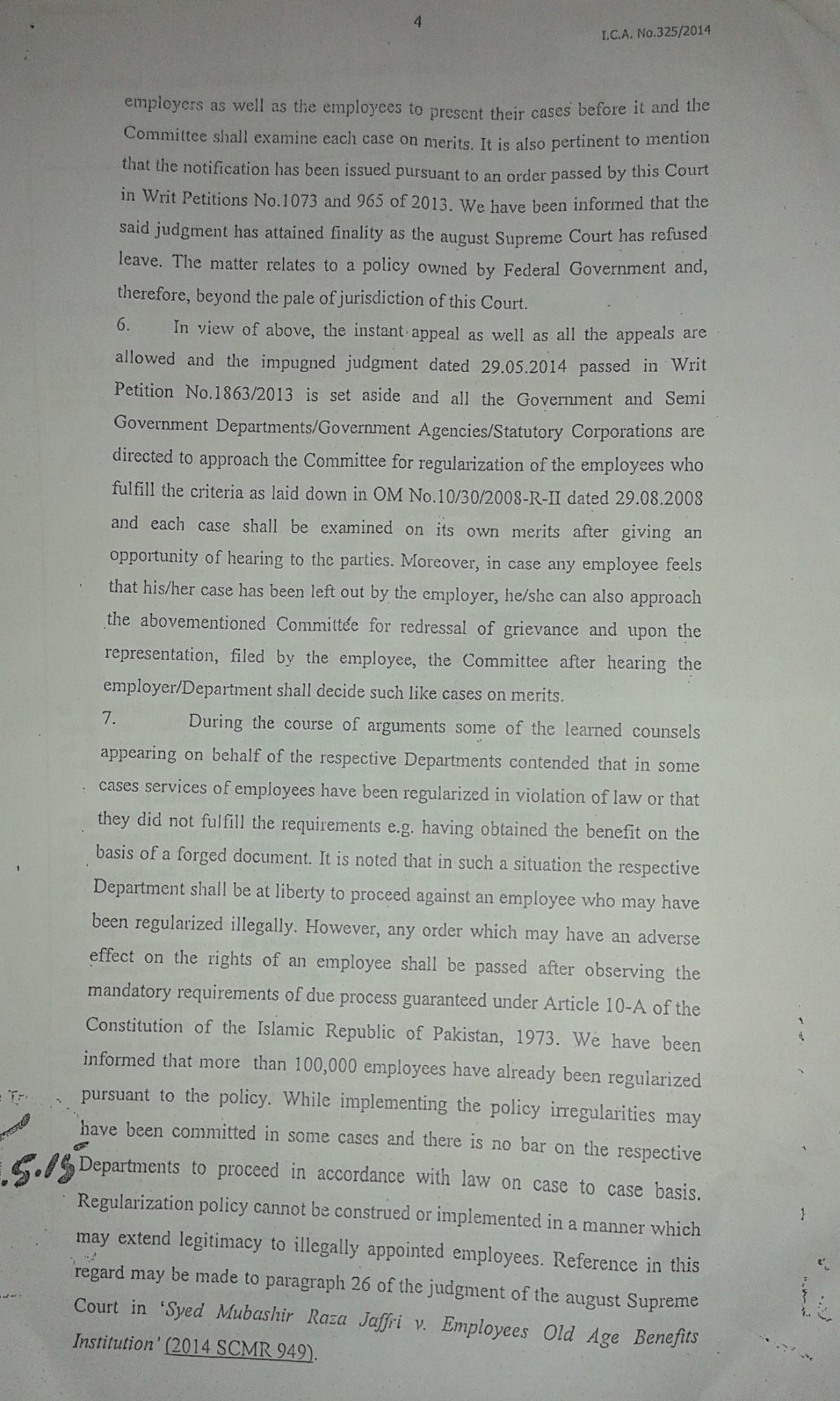 In view of above, the instant appeal as well as all the appeals are allowed and the impugned judgment dated 29.05.2014 passed in Writ Petition No.1863/2013 is set aside and all the Government and Semi Government Departments/Government Agencies/Statutory Corporations are directed to approach the Committee for regularization of the employees who fulfill the criteria as laid down in OM No.10/30/2008-R-II dated 29.08.2008 and each case shall be examined on its own merits after giving an opportunity of hearing to the parties. Moreover, in case any employer, he/she also approach the abovementioned Committee for redressal of grievance and upon the representation, filed by the employee the Committee after hearing the employer/Department shall decide such like cases on merits. More details are available at the copy of the decision.