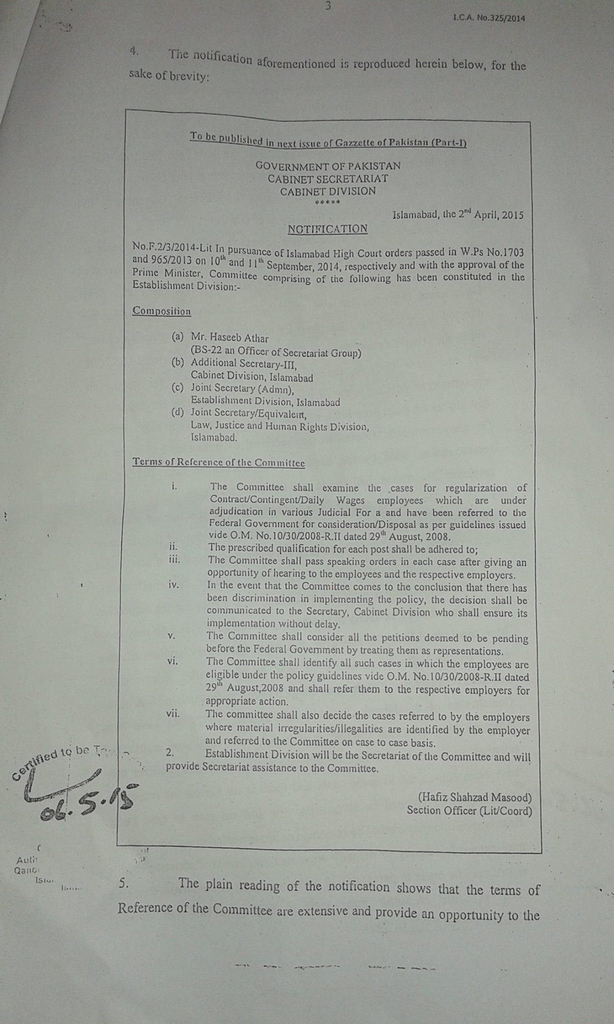 The plain reading of the notification shows that the terms of Reference of the Committee are extensive and provide an opportunity to the employers as well as the employees to present their cases before it and the Committee shall examine each case on merits. It is also pertinent to mention that the notification has been issued pursuant to an order passed by this Court in Writ Petition No.1073 and 965 of 2013. We have been informed that the said judgment has attained finality as the august Supreme Court has refused leave. The matter relates to a policy owned by Federal Government and, therefore, beyond the pale of jurisdiction of the Court.